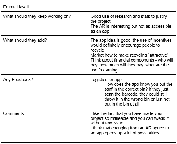 During the critique session I presented this information to my team and received some feedback as well as showing them the simulation of the AR world I had created on Adobe Aero.
